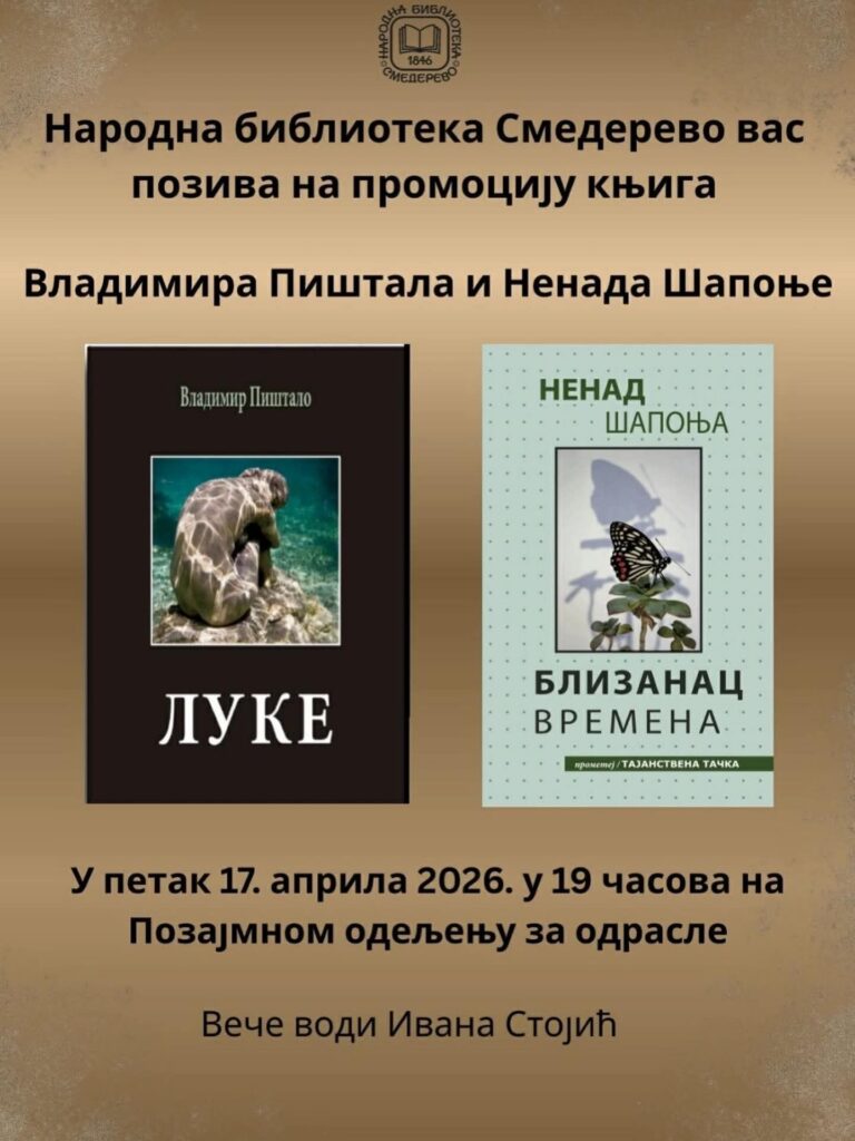 У петак, 17. априла 2026. године, са почетком у 19 часова, на Позајмном одељењу за одрасле, биће одржана промоција књига истакнутих савремених српских аутора Владимира Пиштала и Ненада Шапоње.